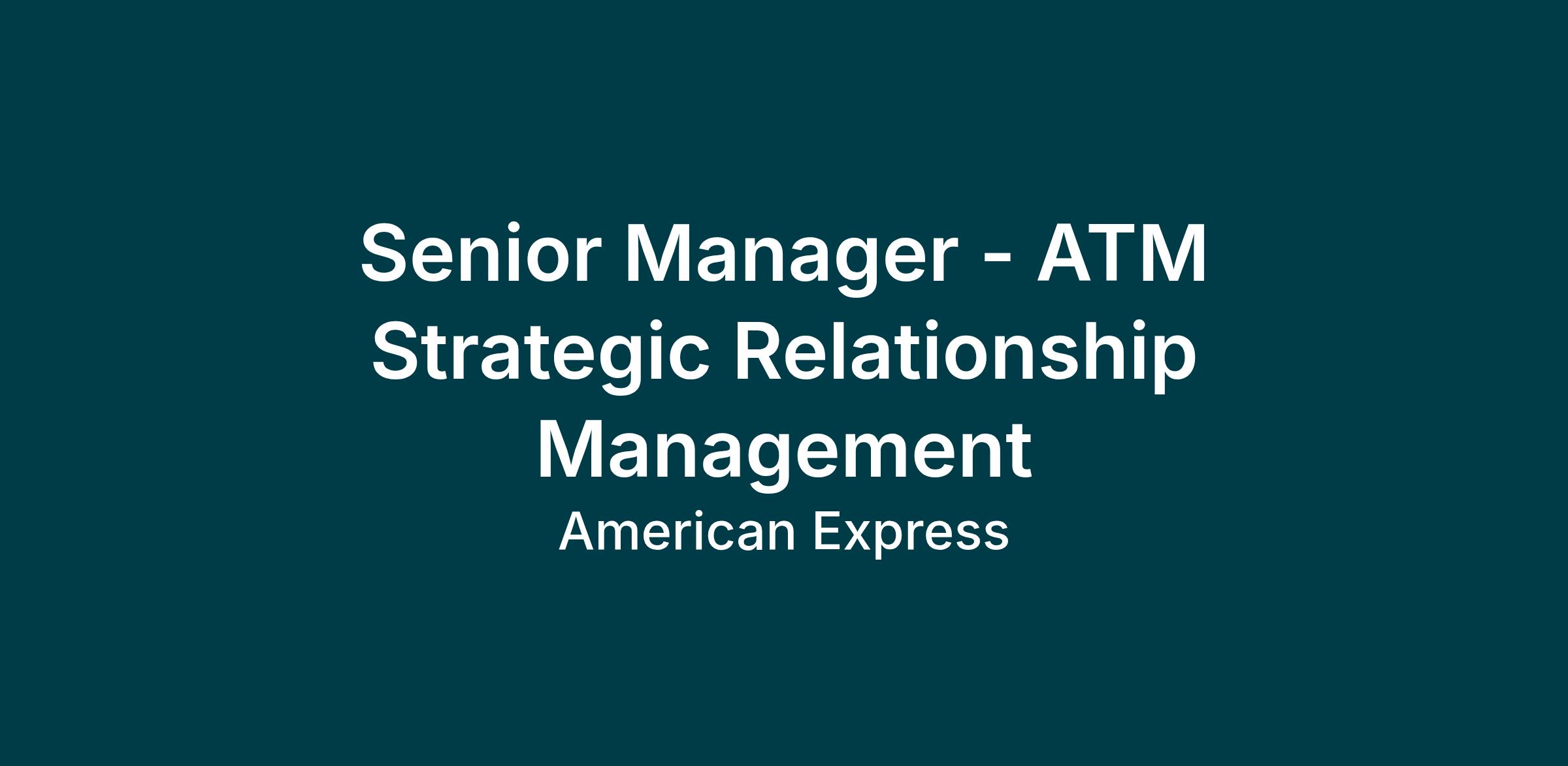 Reporting to Director Global ATM Business Development & Strategy, the Senior Manager - ATM Strategic Relationship Management position is an exciting opportunity for an experienced business development professional to drive external change and enhanced control oversight for the Amex ATM business. The role will allow you to devise & implement strategies to meet company needs through a mix of: