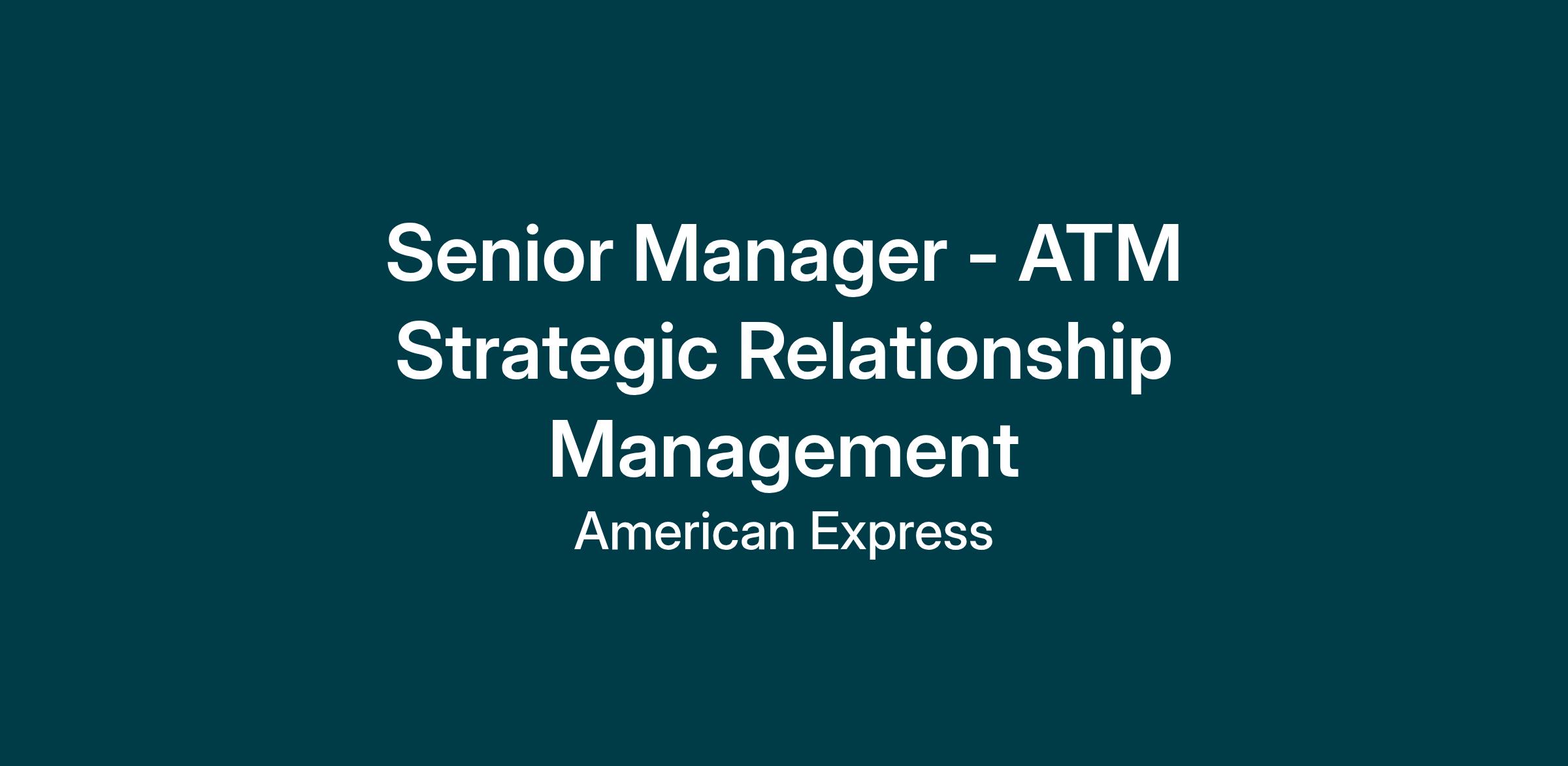 Reporting to Director Global ATM Business Development & Strategy, the Senior Manager - ATM Strategic Relationship Management position is an exciting opportunity for an experienced business development professional to drive external change and enhanced control oversight for the Amex ATM business. The role will allow you to devise & implement strategies to meet company needs through a mix of: